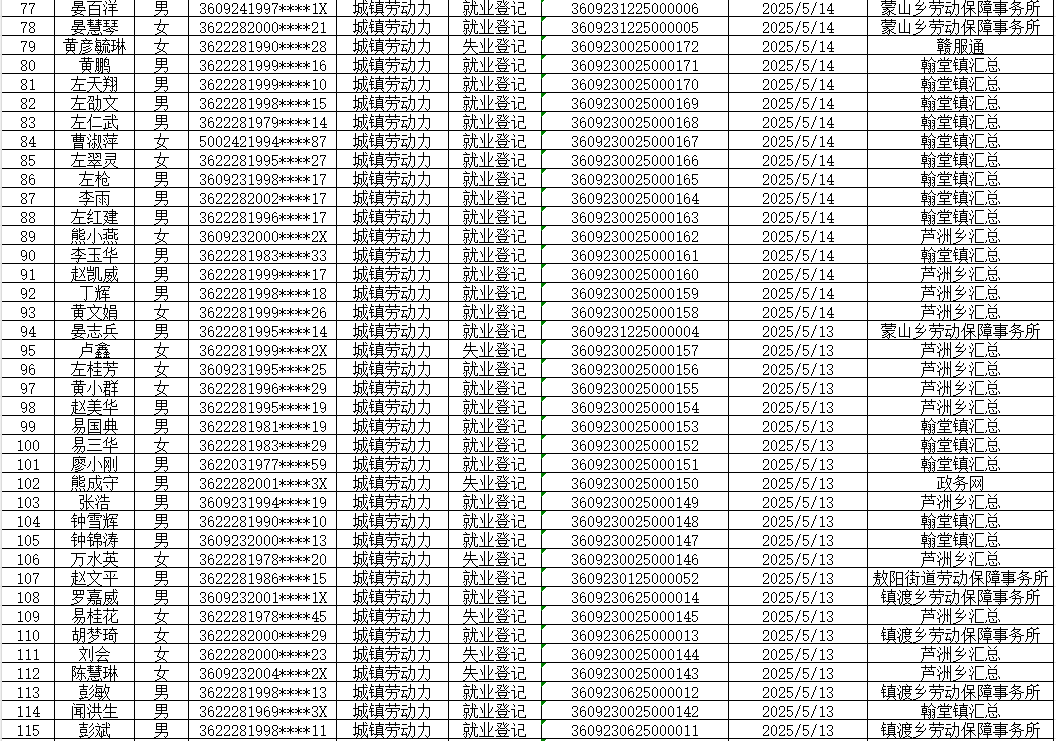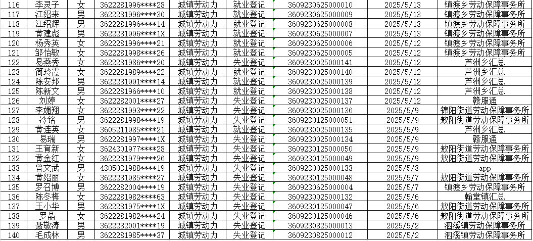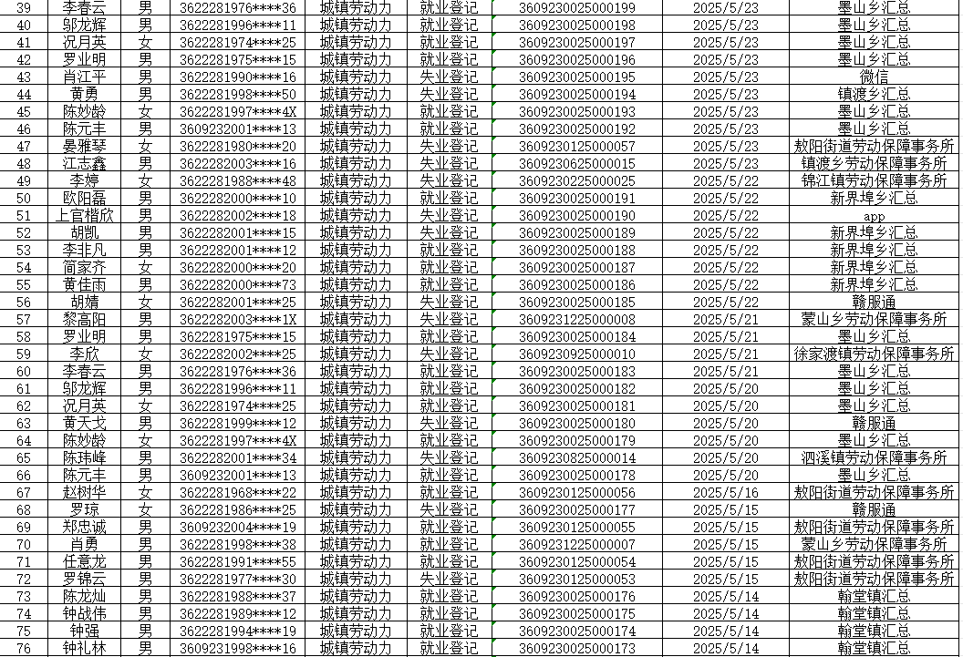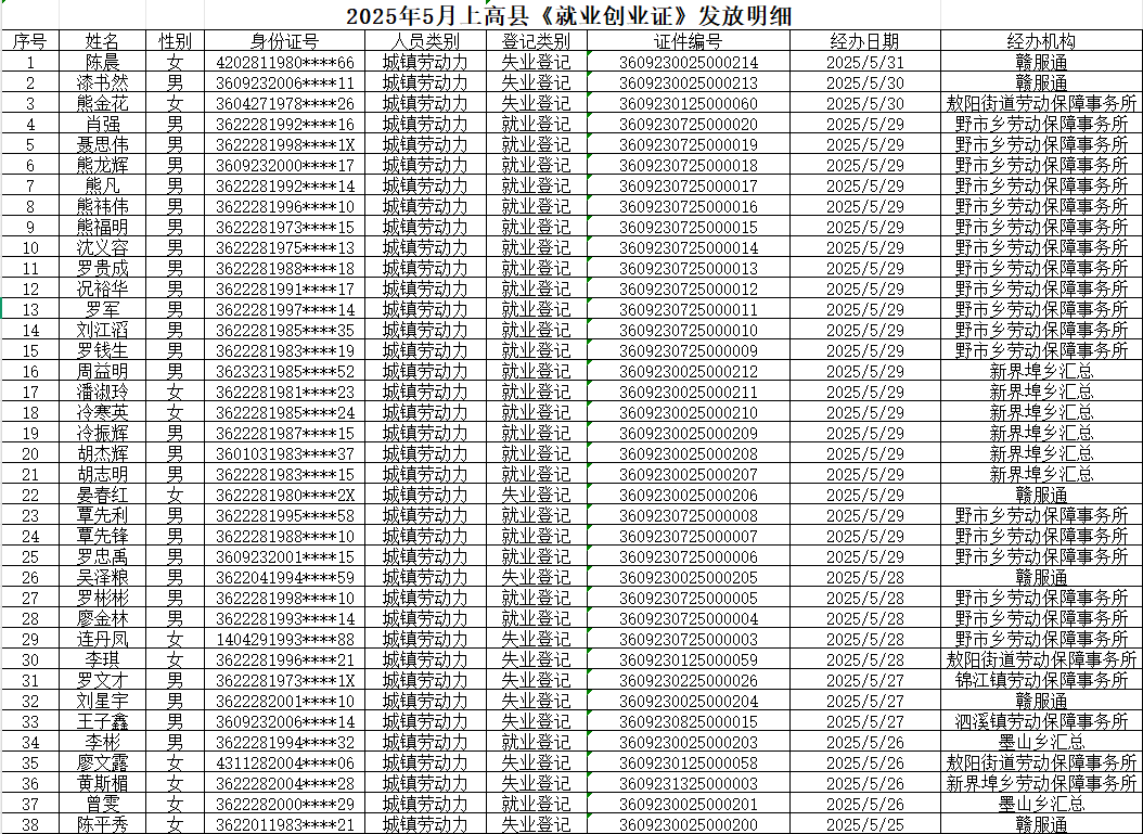 2025年5月上高县《就业创业证》发放明细