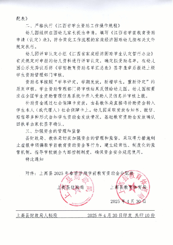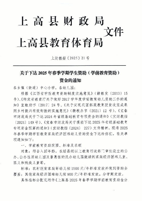 关于下达2025年春季学期学生资助(学前教育资助)资金的通知
