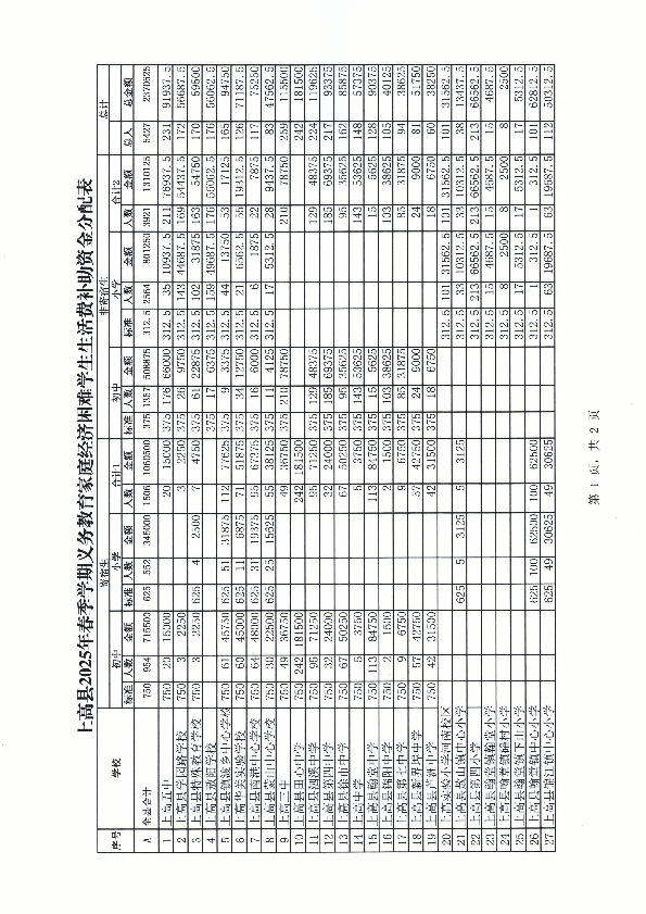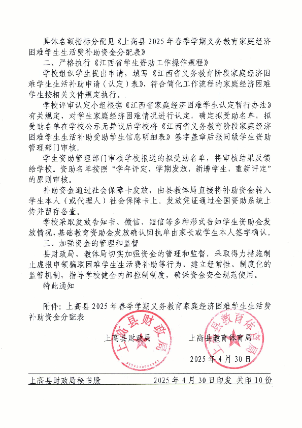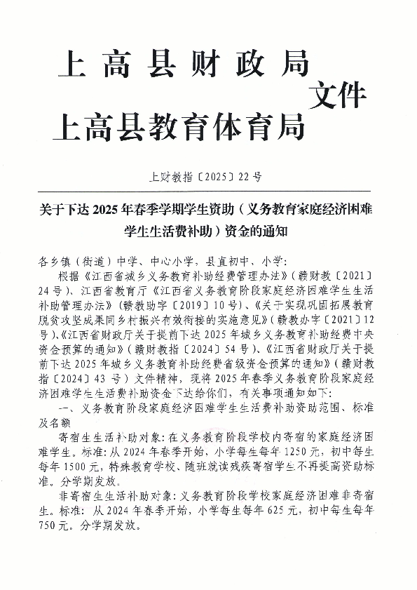 关于下达2025年春季学期学生资助(义务教育家庭经济困难学生生活费补助)资金的通知